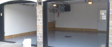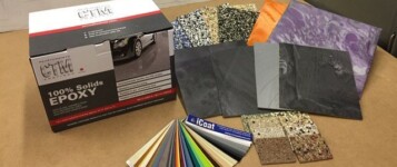 The 100% Solids Epoxy Kit is a Canadian-made industrial strength product that has been especially tailored for residential use. It is a decorative floor finish, packaged and ready for Do-It-Yourself application on garage floors, basements and so much more! It is formulated to provide a sharp finish that can be customized to suit any needs. The 100% Solids Epoxy is featured in a wide variety of designs.